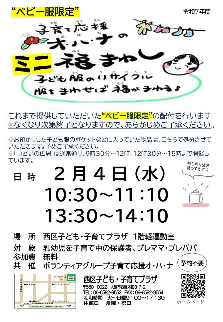 つどいの広場の中で、ボランティアグループ「子育て応援オ・ハ・ナ」さんによる“乳児限定”「ミニ福まわし」を開催します。これまで提供していただいた“ベビー服”の配布をおこないます。
