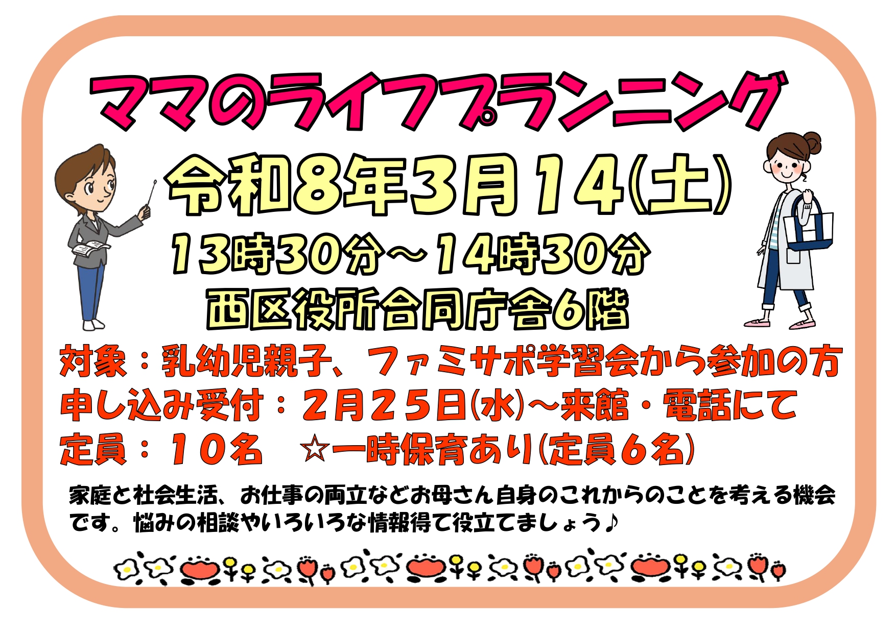 家庭と社会生活、お仕事の両立などお母さん自身のこれからのことを考える機会です。出産を機に仕事を辞めたけど…これから仕事を始めたいけど…育休復帰がもうすぐ!などのお悩みはありませんか?不安や悩みの相談をしたり、色々な情報を得て役立てましょう。