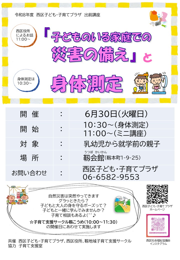 10時30分~プラザによる「身体測定」、11時~西区役所防災担当による出前講座「子どものいる家庭での災害の備え」のお話をします。