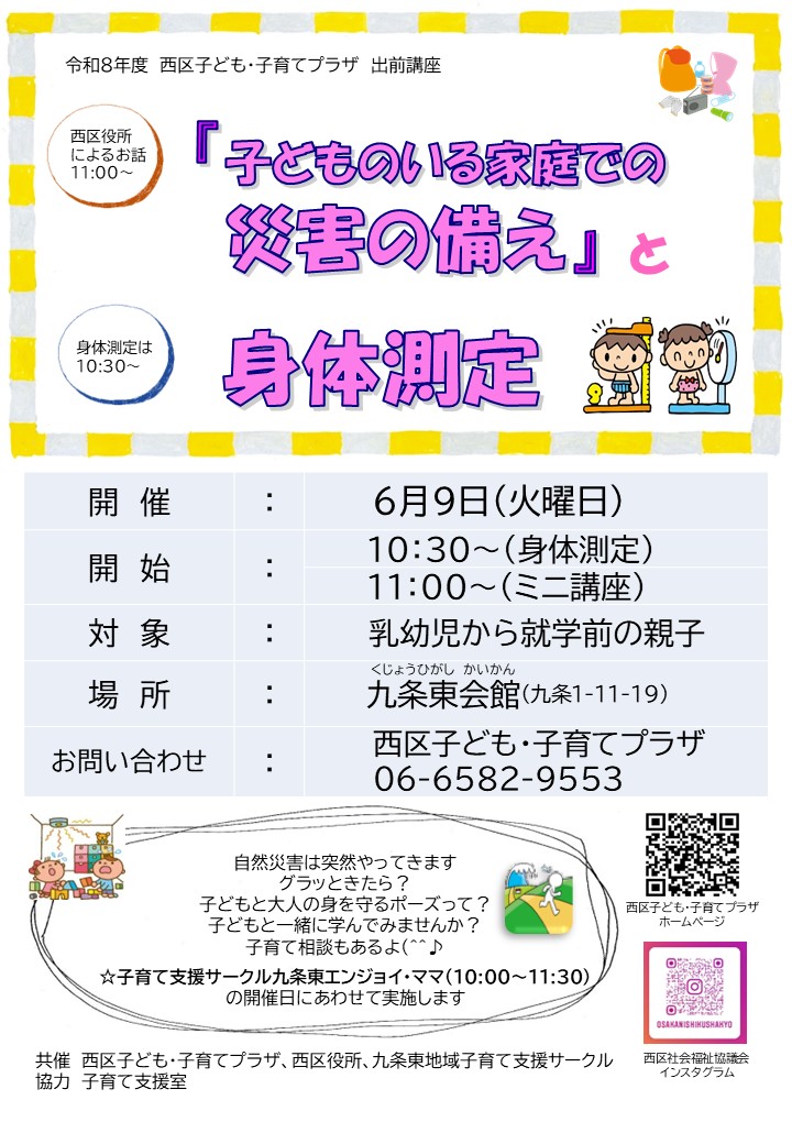 10時30分~プラザによる「身体測定」、11時~西区役所防災担当による出前講座「子どものいる家庭での災害の備え」のお話をします。