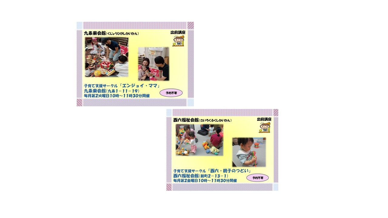 ☆乳幼児親子を対象とした九条東地域子育て支援サークル「エンジョイ・ママ」は、毎月第2火曜日10時~11時30分の間、九条東会館 1階(九条1-11-19)で開催されます。